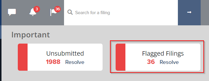 - Filter for "Flagged" Filings - On the "Filings" list page (click on the left navigation bar), search for "Flagged" filings.