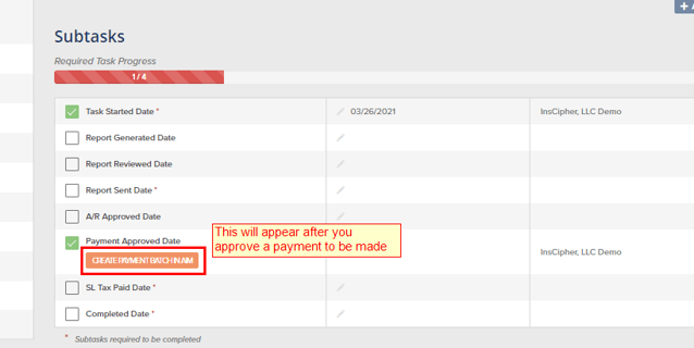 Step 3: After you have verified the correct filings are associated with the task and are now ready to make the payment, add the “Payment Approved” date. This action will then cause a button to appear that will allow you to create a payment batch in your AIM® accounting database. You can then click the button "CREATE PAYMENT BATCH IN AIM".
