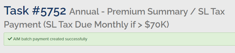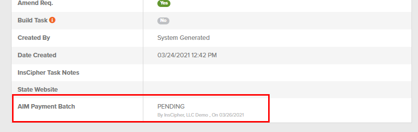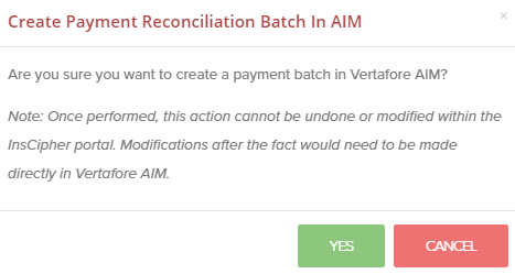 CAUTION: Once this "Create Payment Batch in AIM" action is performed it cannot be undone or modified within the InsCipher portal. Modifications after the fact would need to be made directly in Vertafore AIM®.