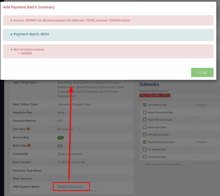 IMPORTANT: Only transactions that have been imported into InsCipher using the AIM® integration tool and that have a valid "Invoice Number" can be exported back into AIM® via payment batches. This payment feature is not designed or meant to be used separately from the functionality of importing transactions. This system would show validation errors should a user attempt to create a payment batch that doesn't have a valid invoice number within AIM®.
