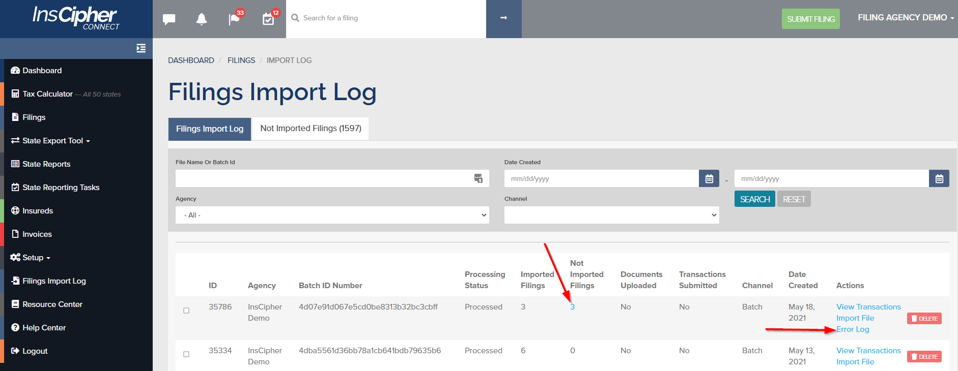 - You can also click under the "Not Imported Filings" or the "Error Log" to download a list of errors in the batch.