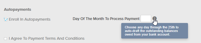 - Autopayments - We have an option for payments to be auto-drafted from the EFT account. You can set the day of the month that these go out. Please ensure all payments are made on time.